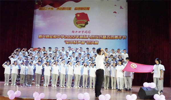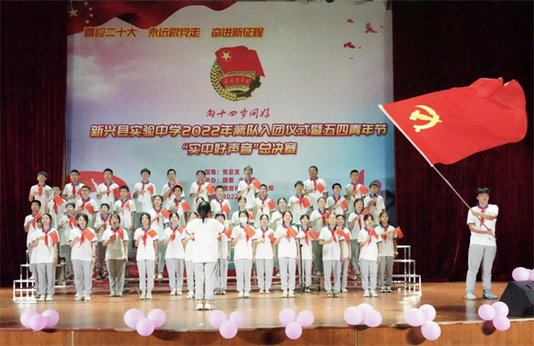 为庆祝中国共产主义青年团成立100周年,团结引领广大团员和青少年永远跟党走,奋进新征程,以实际行动迎接党的二十大胜利召开,营造积极向上、健康文明的校园文化氛围,给广大学生提供展示才华的舞台,近日,新兴县实验中学举行2022年“向十四岁问好”离队入团仪式暨五四青年节“实中好声音”总决赛。