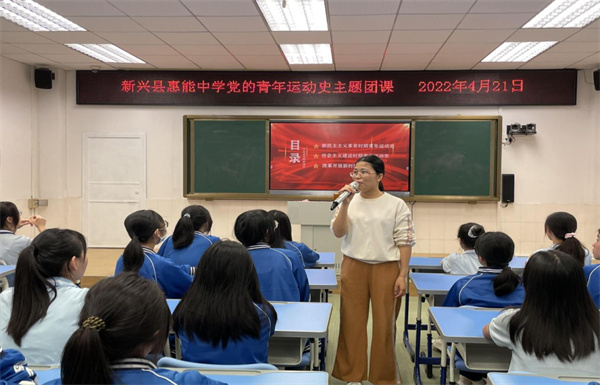 近日,新兴县惠能中学开展了“喜迎二十大,永远跟党走,奋进新征程”系列主题实践活动。为学生团员上一节党的青年运动史主题团课,激励广大学生在新的历史时期高举五四旗帜,努力学习科学文化知识,为建设祖国奉献青春与活力。