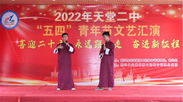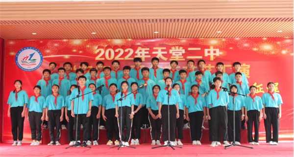 近日,天堂镇第二初级中学举行“喜迎二十大,永远跟党走,奋进新征程”五四文艺汇演。小品、跳舞、歌舞、独唱、诗歌朗诵、大合唱、社团秀、相声等节目精彩纷呈,充分展现了中学生的蓬勃朝气。文艺汇演压轴节目大合唱《少年中国说》,歌声铿锵有力,传递着盼望祖国繁荣富强的强烈愿望。