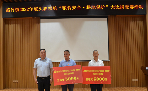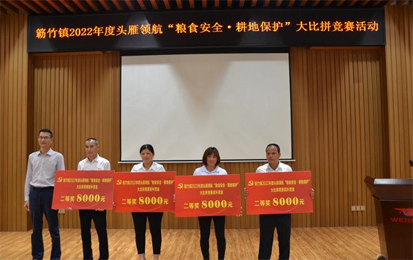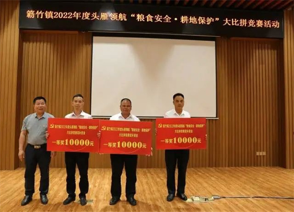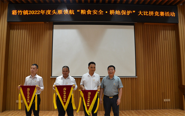 竞赛中,簕竹镇9个村(社区)支书及六联、大坪第一书记轮番上阵,结合自身实际,围绕“粮食安全耕地保护”主题,在“田长制”整治耕地抛荒弃耕、土地流转、保护粮食等方面作了精彩的发言,全方位展示了“领头雁”的担当作为。活动根据实地考核和现场评分,评出一二三等奖。伍树全为获得一等奖的良洞村、永安村、榄根村进行颁奖、授旗。