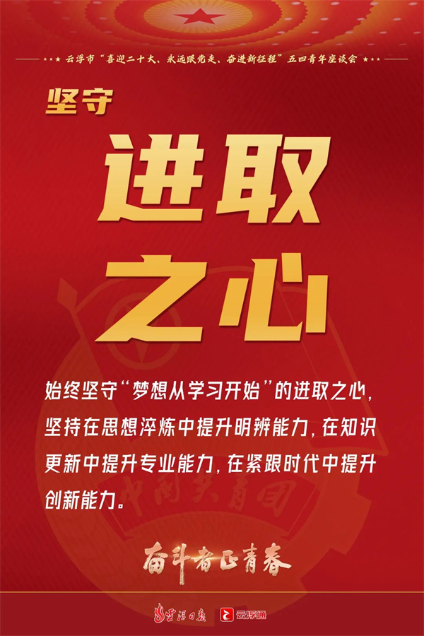5月12日下午,云浮市召开“喜迎二十大、永远跟党走、奋进新征程”五四青年座谈会。会上,市委书记、市人大常委会主任卢荣春强调,青年是国家的希望,也是云浮的未来。全市广大青年要深刻学习体悟习近平总书记重要讲话精神,大力传承和弘扬“五四精神”,坚定扛起新时代赋予青年的光荣使命,躬逢盛世、不负盛世,切实在“打造粤北生态发展新高地、建设高质量发展的美丽云浮”中交出闪亮的青春答卷、谱写属于我们这一代青年的青春之歌。