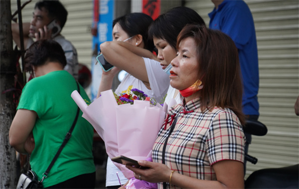 众多父母手捧鲜花前来迎接