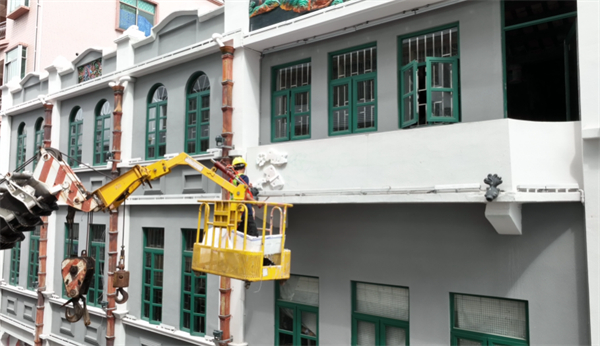 记者在旧城活化改造项目(二期)施工现场看到,商铺外墙已基本完成施工,以米灰色、米黄色为主色调的外墙上用菱形、花瓣等复古元素点缀,重现了岭南建筑风格,令人眼前一亮。其余还没完成的工程,施工人员正在各自点位上抓紧施工。