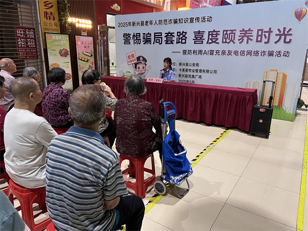 为进一步提升老年人防范电信网络诈骗能力,强化老年人安全防范意识,努力营造“全民参与、全民反诈”的浓厚氛围。2025年5月30日上午,新兴县公安局在县凤凰广场开展了主题为“警惕骗局套路 喜度颐养时光”——提防利用 AI冒充亲友电信网络诈骗的老年人防范诈骗知识宣传活动,为老年群体送上了一份贴心的“防诈指南”,守护他们的养老“钱袋子”。
