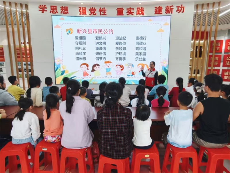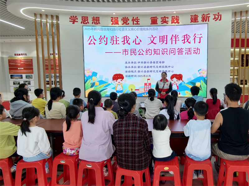 活动当天,实践中心内气氛热烈,众多家长带着孩子踊跃参与。现场布置温馨活泼,充满了学习与互动的氛围。活动内容设计巧妙,将《新兴县市民文明公约》中的条款,如爱护环境、遵守秩序、邻里和睦、诚信友善、勤俭节约等核心内容,融入到形式多样的问答环节中。