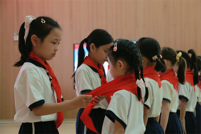 在热烈的掌声中,老队员们郑重地为新队员佩戴上红领巾,鲜艳的红领巾在新队员胸前飘扬。新队员们在大队委的带领下庄严宣誓,他们高举右拳,声音稚嫩却坚定,字字誓言表达着为共产主义事业贡献力量的决心。
