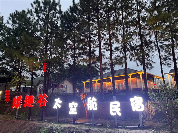 蝶趣谷太空舱民宿位于六祖镇龙山塘村,10座造型独特的“太空舱”点缀在乡村中,格外引人注目。传统田园风光和充满科技感的现代化元素在这里完美融合,碰撞出了别样的火花。时下,民宿作为新兴的旅游住宿业态,正以其独特的魅力和优势走红文旅消费市场,吸引更多人来体验这一诗意地栖居空间。“太空舱”因其可以打破地形限制,为游客提供全新的旅居体验,成为网红新宠。