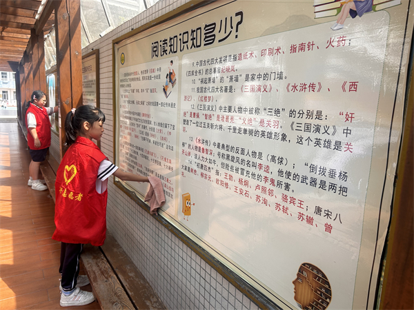 校园内的文化展示牌是传播文明的重要窗口。小志愿者们带着清洁工具,小心翼翼地擦拭展示牌表面的污渍与灰尘,让一块块展示牌重新焕发光彩,成为校园里一道整洁靓丽的风景线,也让文明氛围更加浓厚。